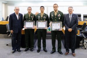 A Assembleia Legislativa da Paraíba (ALPB) realizou, na manhã desta quarta-feira (3), sessão solene marcada por homenagens a quatro militares que têm contribuído para ações sociais, humanitárias e de segurança no estado. Presidida pelo deputado João Gonçalves, autor das proposituras, a solenidade concedeu Títulos de Cidadão Paraibano ao Coronel Rafael José Vieira Barreto, ao Tenente-Coronel Diego Pereira Pedra, ao Tenente-Coronel Vicente de Paulo Campos Júnior e ao General de Brigada Klauber Rogério Candian — este também agraciado com a Medalha Epitácio Pessoa, a mais alta honraria da Casa.