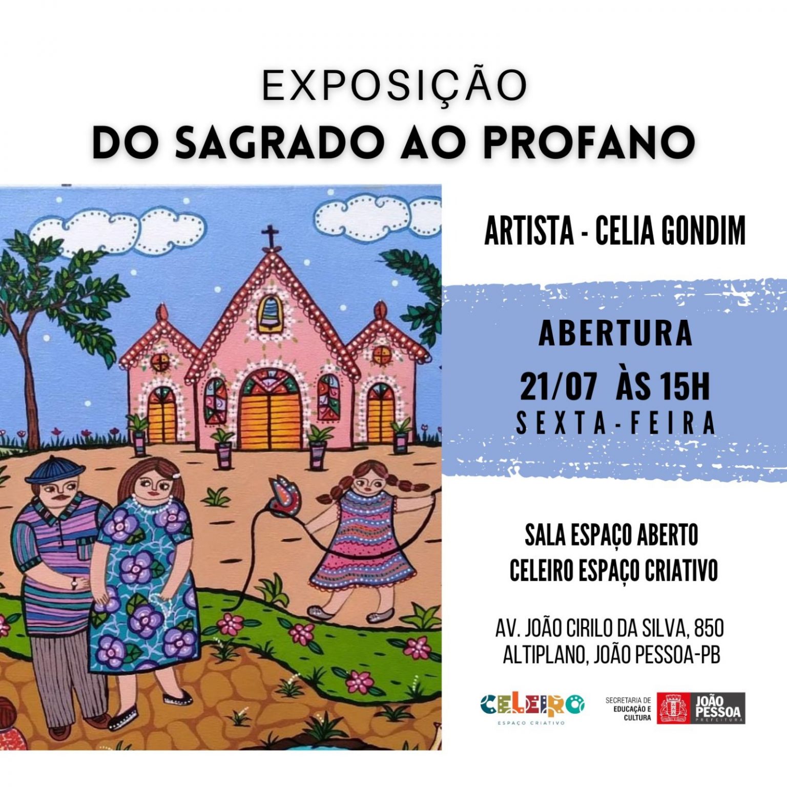 “As obras de Célia Gondim são trabalhadas em arte Naif. Dentro dessa questão de sagrado e profano, ela entra também na religiosidade. Não só a religiosidade cristã, mas também no hinduísmo, nas religiões de matrizes africanas. Na questão do profano, ela trabalhao cotidiano, o obsceno, além do Carnaval, com obras ligadas ao Homem da Meia Noite e ao Galo da Madrugada. São esses elementos que o público poderá acompanhar na exposição dela”, destacou o curador do Celeiro, Ilson Moraes.