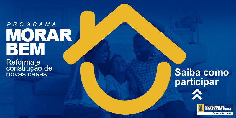 Conforme a Lei Municipal n° 1.064, de 22 de maio de 2019, o Prefeito de Pedras de Fogo, Manoel Alves da Silva Junior, no uso de suas atribuições comunica que se encontram abertas as inscrições para o PROGRAMA MUNICIPAL DE HABITAÇÃO MORAR BEM. O programa será destinado à construção de novas casas de Habitação Popular, Reforma e Regularização Fundiária, aos interessados que atenderem as condições previstas no regulamento de cadastro habitacional.