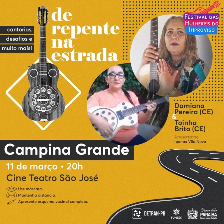 O FEMI acontecerá no dia 11 de março, no Cine Teatro São José, em Campina Grande, incluindo-se, ainda, na programação do ‘Mês das Mulheres’ e do ‘De Repente na Estrada’, proposta de interiorização da cantoria executada pela Funesc e que, até o fim do ano, vai percorrer 12 cidades paraibanas. Os programas e o Festival são apresentados por Iponax Vila Nova, declamador e coordenador do projeto.