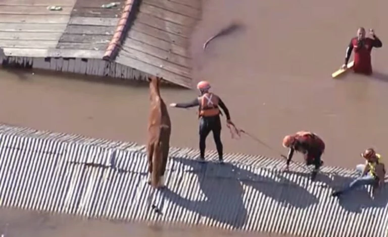 O cavalo que ficou ilhado por cerca de quatro dias em cima do telhado de uma casa em uma área alagada na cidade de Canoas, no Rio Grande do Sul, foi resgatado na manhã da última quinta-feira (9).