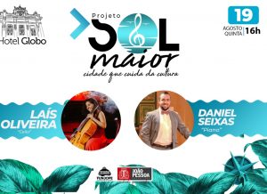 O projeto ‘Sol Maior’ desta quinta-feira (19) vai levar música ao Hotel Globo, um dos mais belos símbolos do Centro Histórico de João Pessoa. Nesta edição, os convidados são Laís Oliveira, que vai apresentar os acordes do cello, e Daniel Seixas, que vai embalar o fim de tarde com as notas do piano. As apresentações do ‘Sol Maior’ acontecem a partir das 16h. A entrada é gratuita e o uso de máscara é obrigatório.