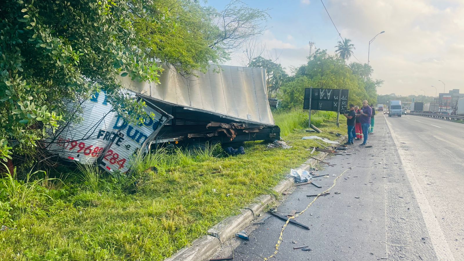 Com o impacto, a lateral e a parte traseira do baú foram destruídas, ficando presas na estrutura do ônibus. Dentro do caminhão estavam o motorista e um ajudante. Ambos foram arremessados com a batida: o motorista caiu sobre a rodovia e o ajudante foi lançado para a área de vegetação próxima.