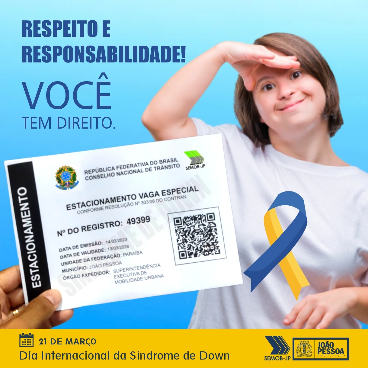 “Neste Dia Mundial da Síndrome de Down, reforçamos o compromisso da gestão municipal em cuidar das pessoas que necessitam de atenção especial e, através da garantia ao estacionamento prioritário, a Semob-JP vem contribuindo também. Nosso setor de atendimento está inteiramente disponível para receber estas demandas e emitir as credenciais de forma gratuita, tanto ao público com Síndrome de Down quanto às pessoas com deficiência, fibromialgia, transtorno do espectro autista (TEA) ou com mais de 60 anos”, ressaltou Expedito Leite Filho.