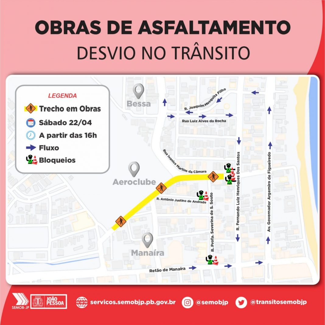 “A Prefeitura está avançando em duas frentes de serviços nas obras de mobilidade e acessibilidade no entorno do Aeroclube. Neste sábado, a previsão é começar a colocar a capa asfáltica, então temos que interditar toda a rua Ivanice Martins Câmara para esse serviço. E amanhã, como já vem há dois domingos, a Energisa está fazendo todo o trabalho de deslocamento da rede elétrica, deixando livre a área para expansão das obras’, disse Sanderson Cesário, diretor de Operações da Semob-JP.