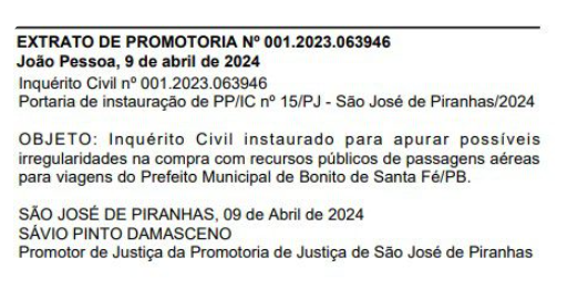 O Ministério Público da Paraíba (MPPB) abriu uma investigação para apurar possíveis irregularidades na compra de passagens aéreas com recursos públicos pelo prefeito de São José de Piranhas. O inquérito civil, coordenado pelo promotor de justiça Sávio Pinto Damasceno, foi divulgado na edição do Diário Oficial desta quinta-feira (11).