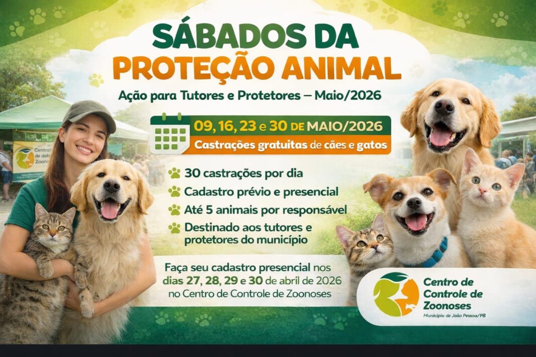 A Prefeitura de João Pessoa, por meio do Centro de Controle de Zoonoses (CCZ), realiza, a partir desta segunda-feira (27) até a sexta-feira (30), o cadastro prévio presencial para castrações de cães e gatos, no CCZ, localizado no bairro dos Bancários. A iniciativa faz parte da ação ‘Sábados da Proteção Animal’, que vai realizar castrações gratuitas para os pets, destinadas a tutores e protetores do Município.