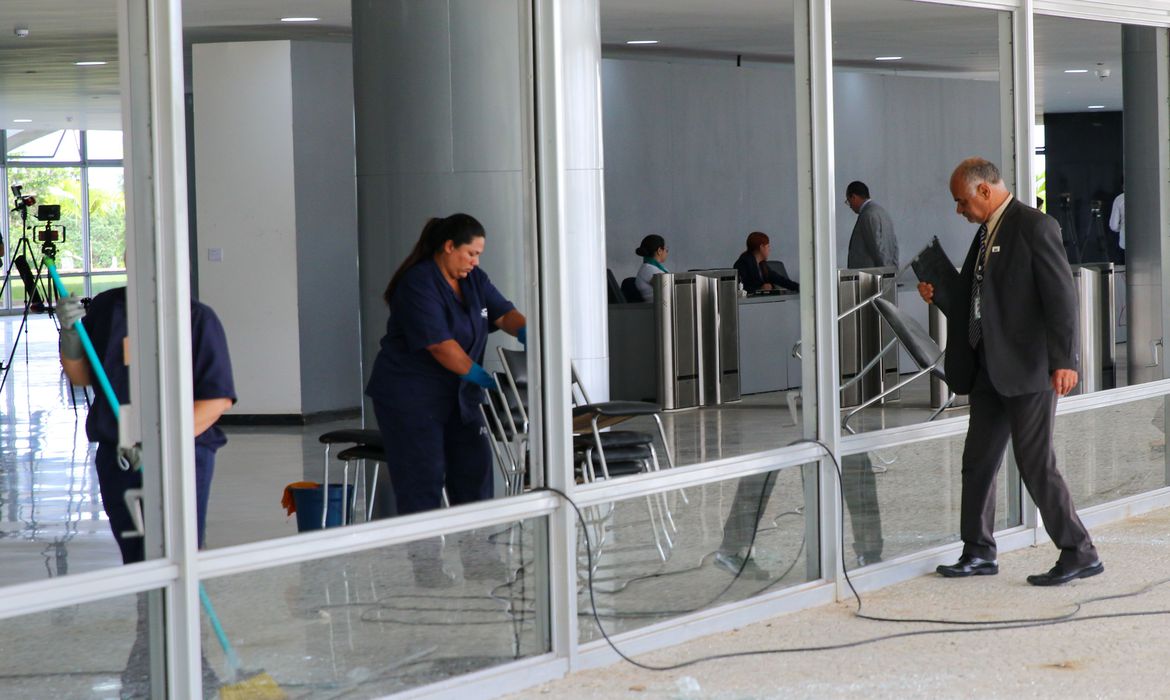 Portas de vidro foram arrancadas e móveis vandalizados, mas os destroços de vidro e a sujeira já haviam sido retirados. Um jornalista se aproximou de um dos funcionários que cuidam da limpeza do Congresso e elogiou o trabalho. Ele apenas agradeceu, acenando com a cabeça, triste e resignado.