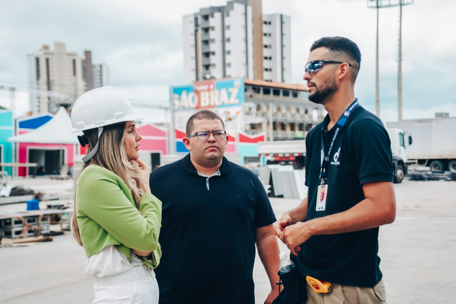 Em seguida Juliana seguiu para a Pirâmide, onde pôde acompanhar as equipes que estavam atuando na cenografia do coração do Parque do Povo. A primeira-dama encerrou a visita após experimentar o tablado com rampa de acesso que foi montado na Pirâmide.