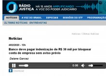 A segunda matéria veiculada tem como foco a decisão da juíza Adriana Barreto Lóssio de Souza, da 9ª Vara Cível da Capital, que condenou o Banco do Brasil a pagar uma indenização, por danos morais, no valor de R$ 30 mil, por ter feito o bloqueio administrativo da conta de uma pequena empresa do ramo da construção.