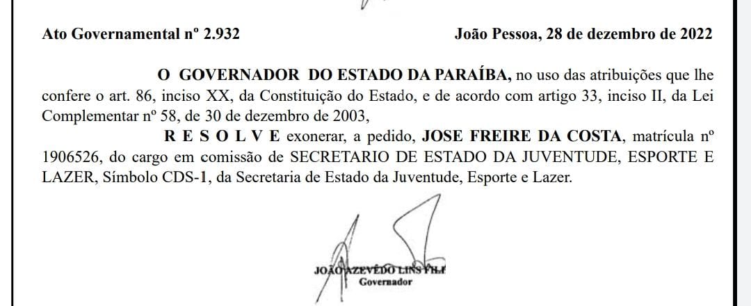 De acordo com o documento, a saída de Zezinho ocorre a pedido e atende a orientação passada aos auxiliares do governo para deixarem os cargos à disposição do governador João Azevêdo. O gestor estadual deve promover uma pequena reforma administrativa em seu próximo governo.