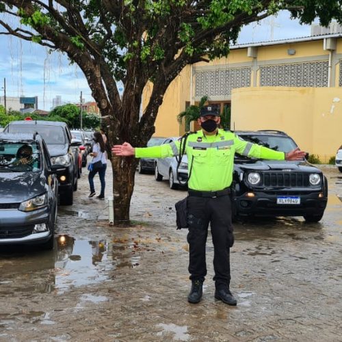 Neste fim de semana, os agentes de mobilidade em campo também estão agilizando o fluxo de veículos no drive thru da vacinação contra Covid-19, no entorno do Santuário Mãe Rainha, no bairro do Aeroclube, na Igreja Universal, na Av. Epitácio Pessoa, e no Mangabeira Shopping.
