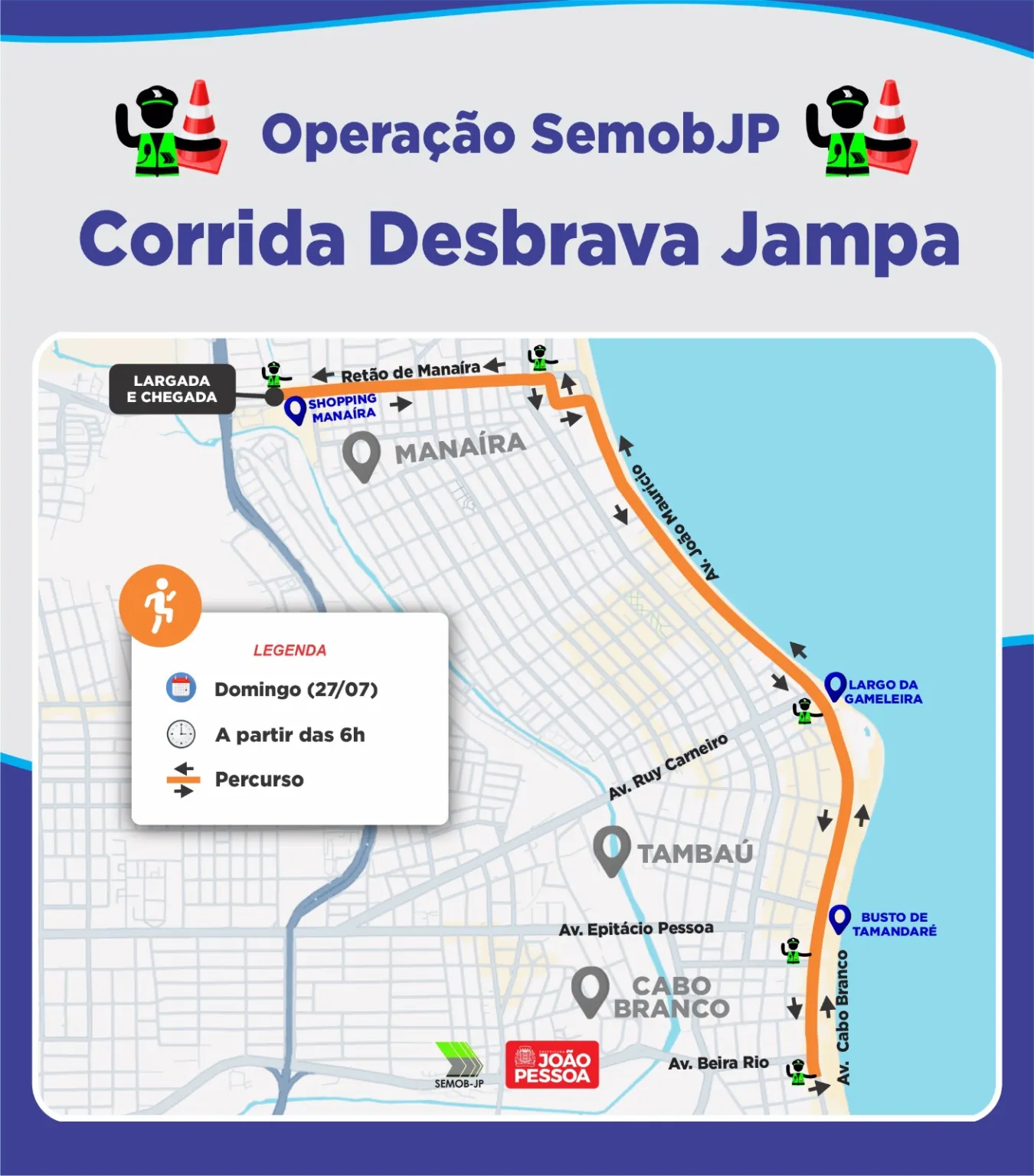 Com o objetivo de garantir a segurança viária e disciplinar o tráfego de veículos, a Superintendência Executiva de Mobilidade Urbana (Semob-JP) realizará, neste sábado (26) e domingo (27), um esquema de trânsito para auxiliar a Carreata de São Cristóvão, Passeata da Igreja do Nazareno, Motociatas em alusão ao Dia do Motorista e Motociclista e a Corrida Desbrava Jampa. Os eventos acontecerão nos bairros de Mangabeira, Bancários, Centro, Cristo e Manaíra.