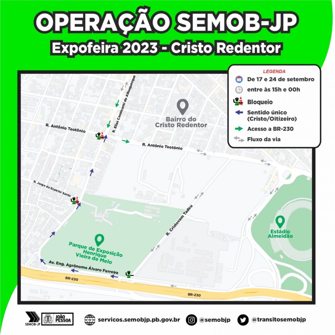 A Superintendência Executiva de Mobilidade Urbana de João Pessoa (Semob-JP) informa a população que transita entre o bairro do Cristo Redentor e a BR-230 que, entre os dias 17 e 24 de setembro, o fluxo de veículos sofrerá intervenção nas imediações do Parque de Exposições Henrique Vieira de Melo, por conta da realização da Expofeira Paraíba Agronegócios 2023.